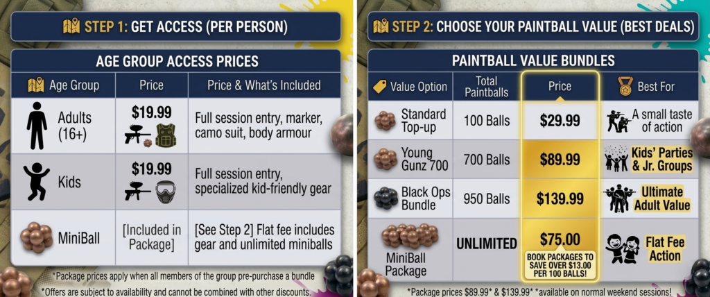 - Commando Pack ($109.99): Includes 750 paintballs, admission, equipment rental, air, gloves, and groin guard.